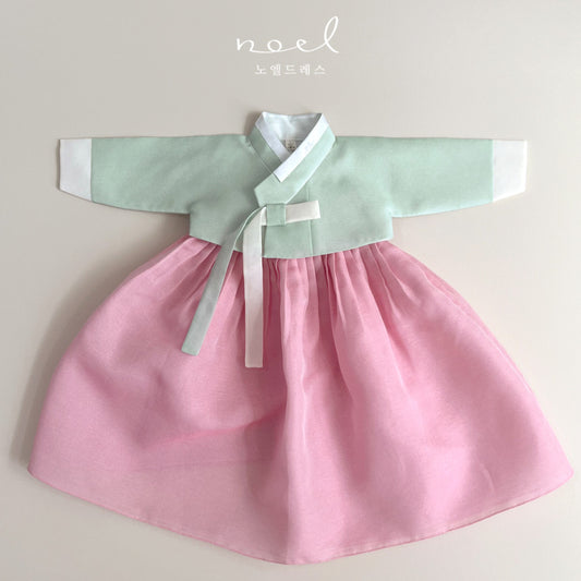 Hee-Sun Classic Hanbok in Mint/Pink, Peach - (100 Days to 15 Years)